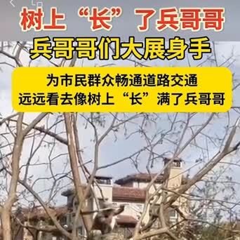 他们很忙,有的砍树,有的扛着树前行,还有的站在树上,远远看去,真的好像树上长满的兵哥哥。